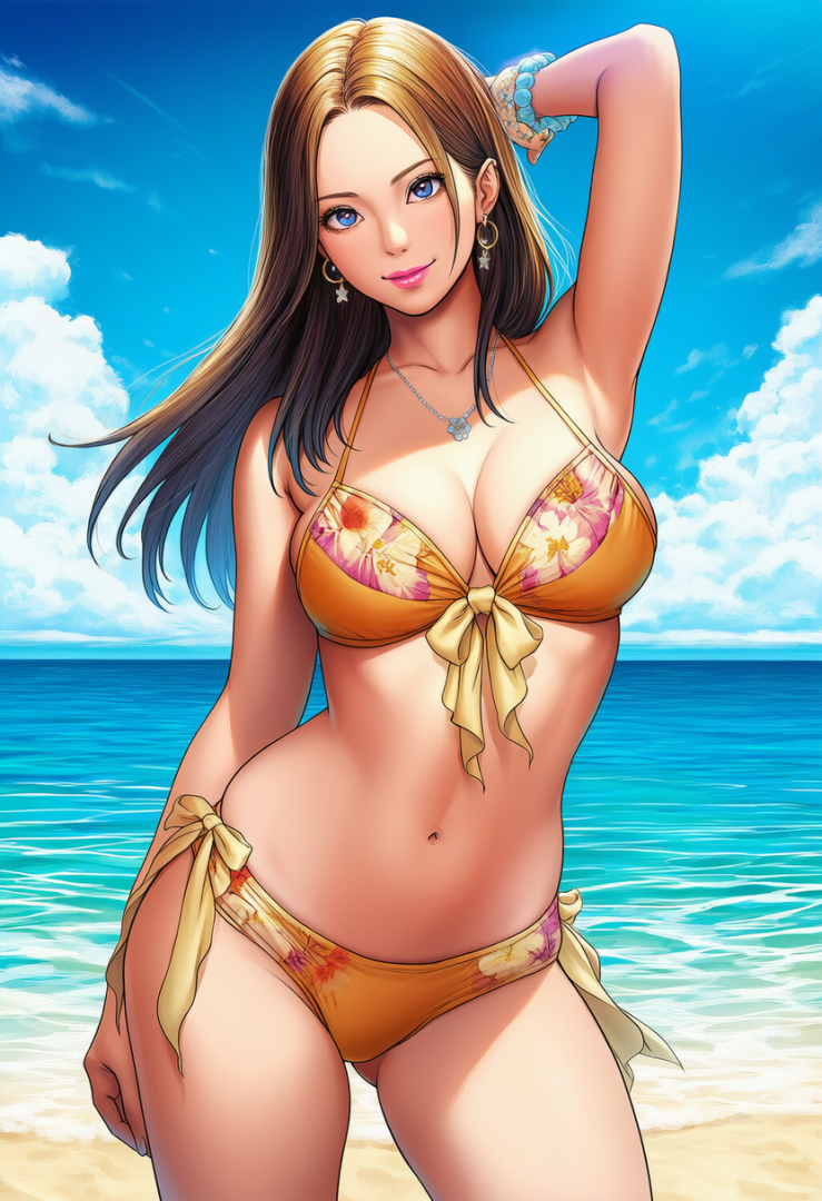 Beautiful anime woman, sexy and elegant, wearing a stylish bikini, posing on a s s-1895084695
